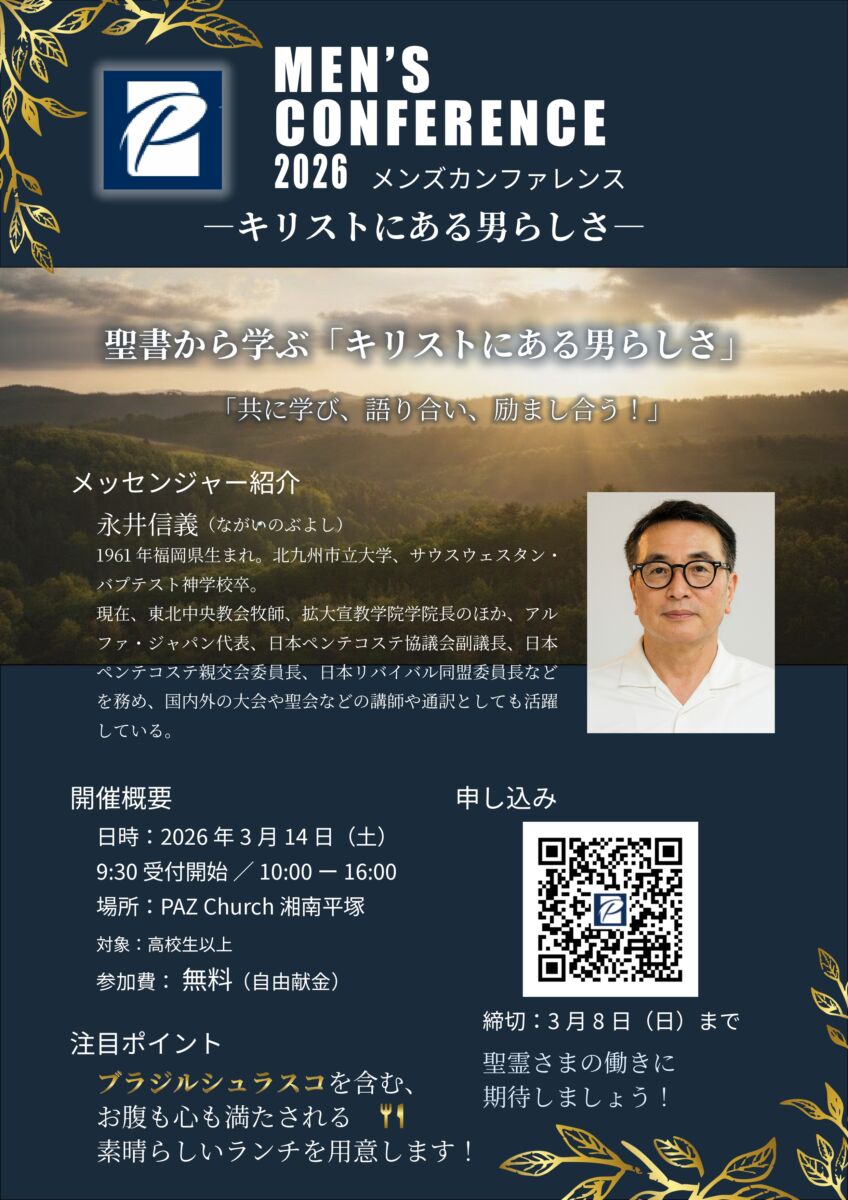 メンズ・カンファレンス 日時:2026年3月14日(土)10:00〜16:00(受付開始 9:30)講師:永井 信義 牧師(東北中央教会) 参加対象:高校生以上の男性参加費:無料参加申し込みはこちらから! 特別 2026/03/14 10:00 ~ 16:00 Paz Shonan Hiratsuka (7-33 Fujimichō 254-0062) Generate iCal